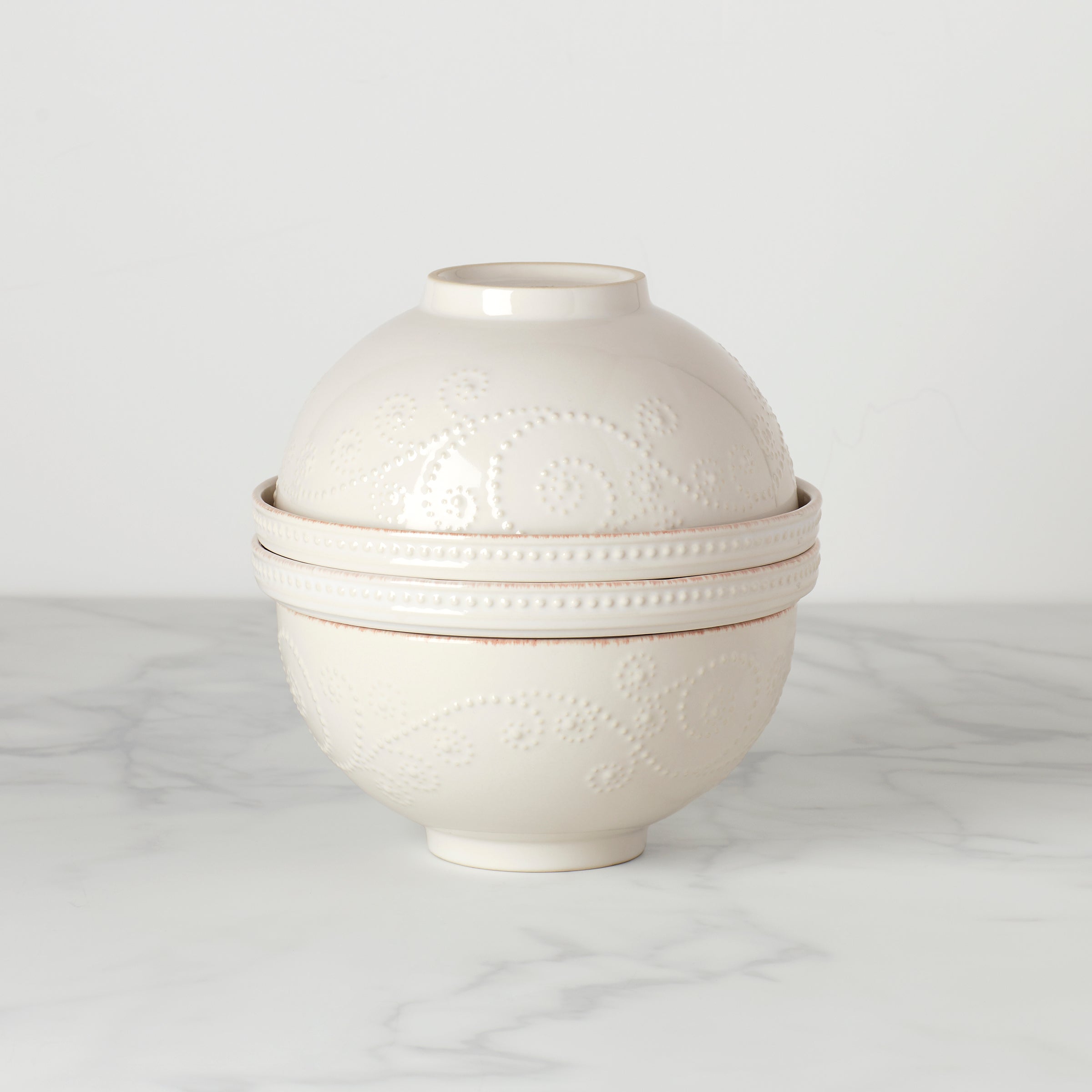 Your favorite Luna nesting dinnerware set now comes in our popular French Perle pattern of raised beads. carved textures. and tea-stain edges. Crafted of stoneware. this stylish space-saver hides six bowls and two plates inside. Take it apart piece by piece to reveal each microwave- and dishwasher-safe component. Put it all back together and it becomes a compact conversation starter for your table!