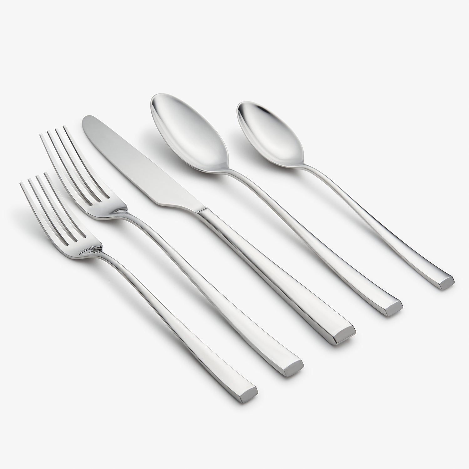 20-piece forged service for 4 with a a modern. angled detail on the tip of the handle and a clean. polished finish.