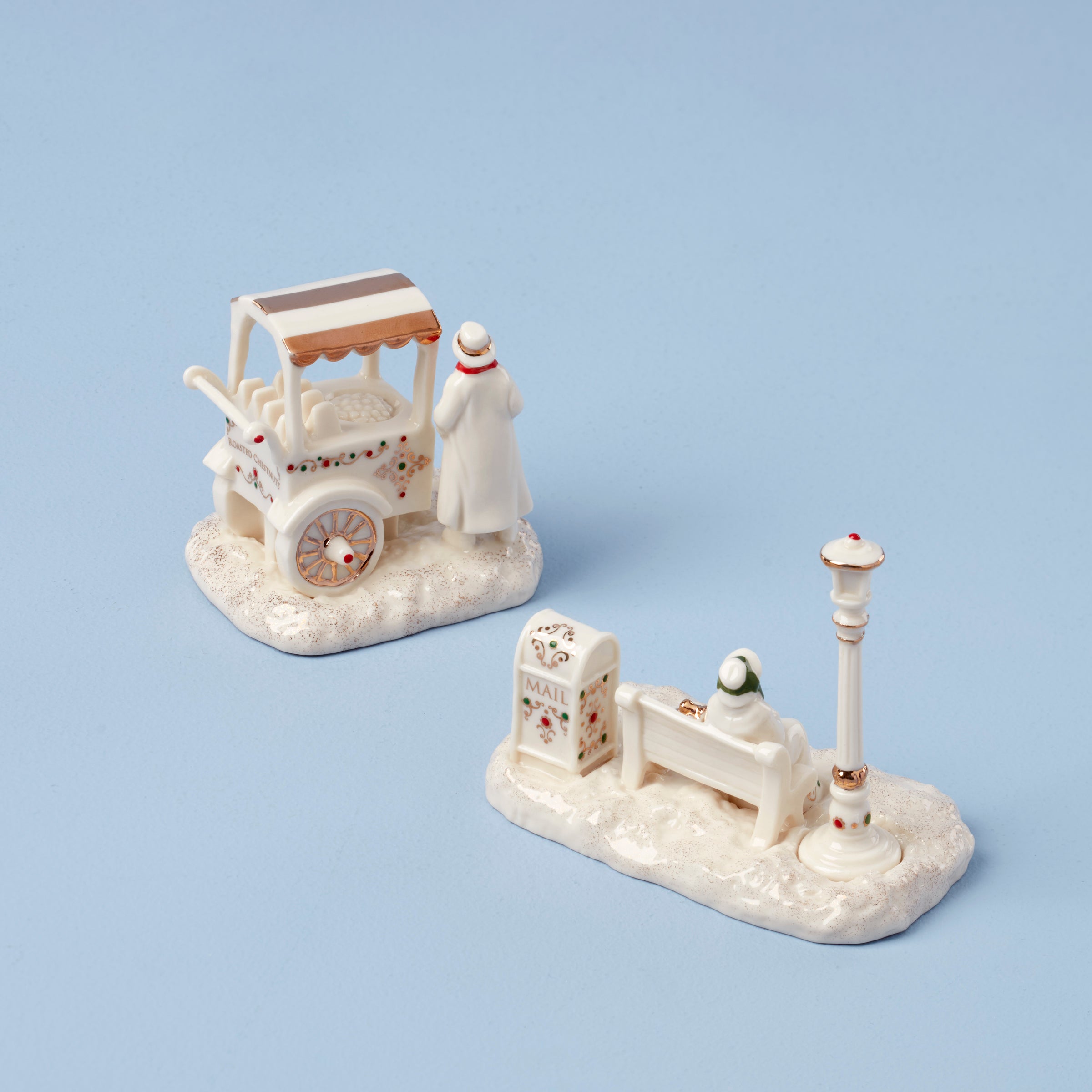 Crafted in creamy porcelain and hand-decorated with 24k gold accents. this figurine set. including a chestnut seller and a person on a park bench. brings the charm of bygone Christmases home. They’re truly charming additions to your Mistletoe Park Village Traditions collection. or any Christmas mantel display!