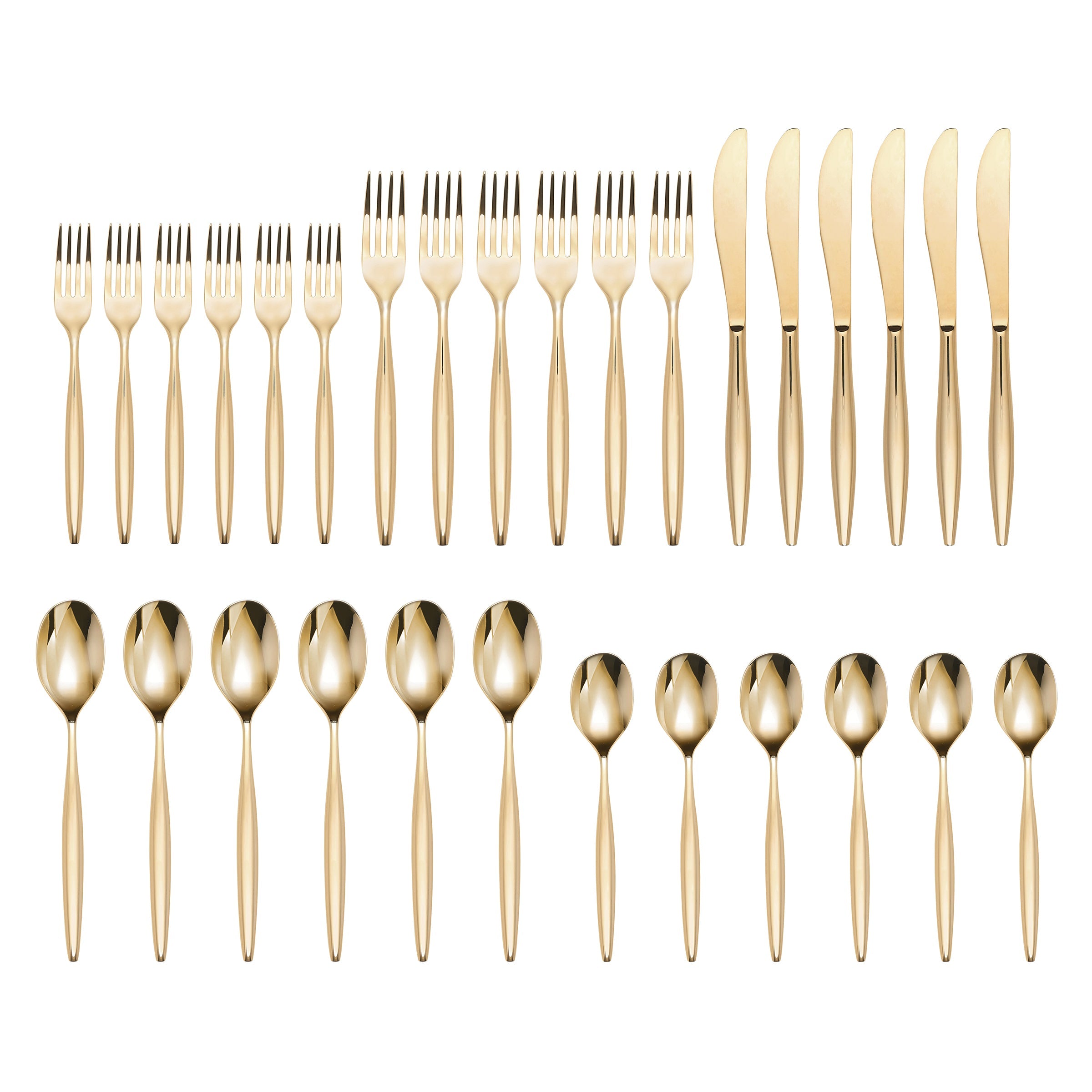 Introducing Braga. a sophisticated 30-piece flatware set that effortlessly elevates your dining experience. With a captivating gold mirror finish and modern design featuring sleek cylindrical handles. Braga effortlessly balances simplicity and style for any table setting.