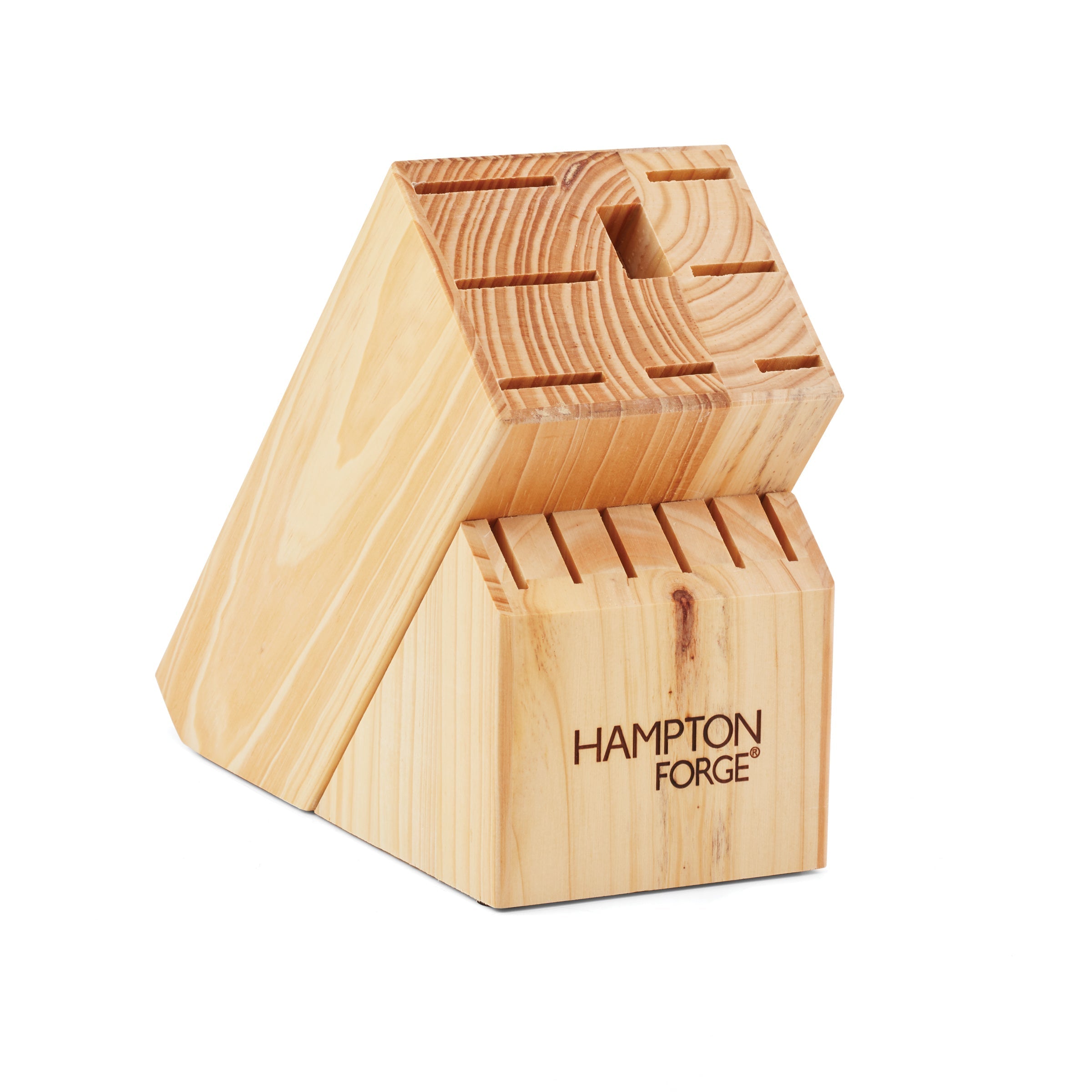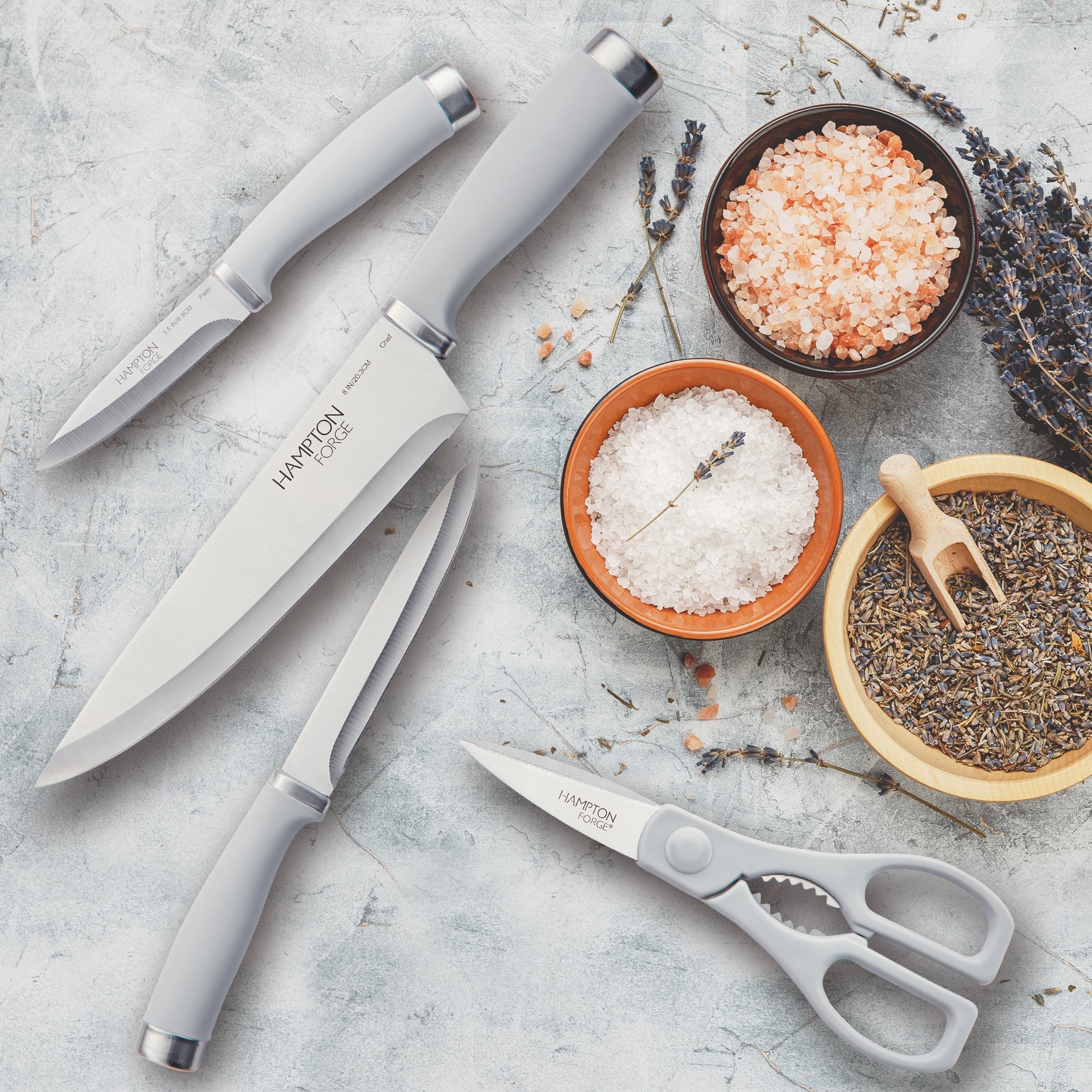 The Epicure Cool Grey 15 Piece Cutlery Block Set by Hampton Forge will quickly become one of your most essential kitchen tools. Whether you’re chopping. cutting. peeling. or slicing. you’ll find these knives indispensable with their superior sharp. fine-edge blades and soft grip handles. With a rustic sensibility and a pop of cool color. Epicure provides any kitchen connoisseur with every knife they need to cook and prepare a feast in style. The set comes with a beautiful pinewood block for easy storage.