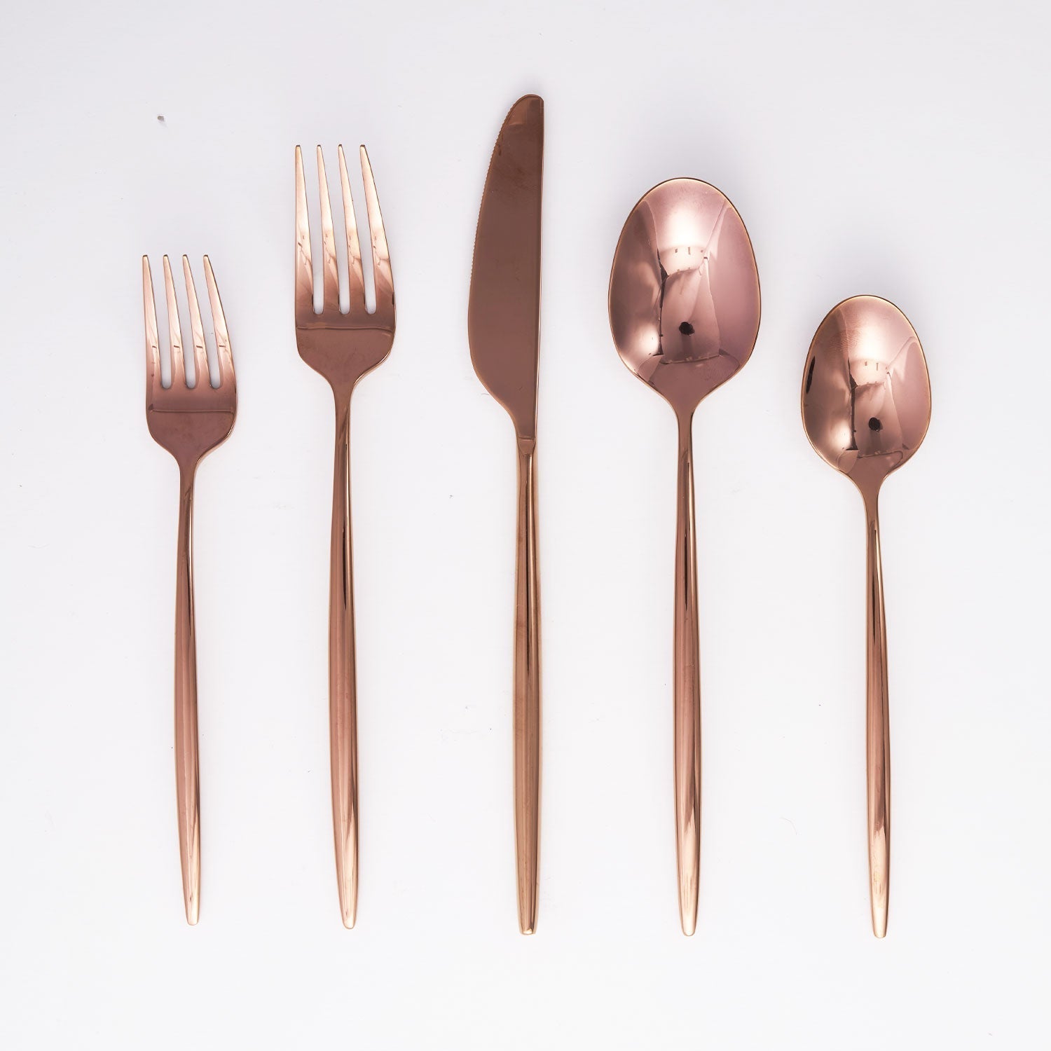 20-piece forged service for 4 with a slender handle that evokes a classic Scandinavian feel in a warm. copper color mirror finish.