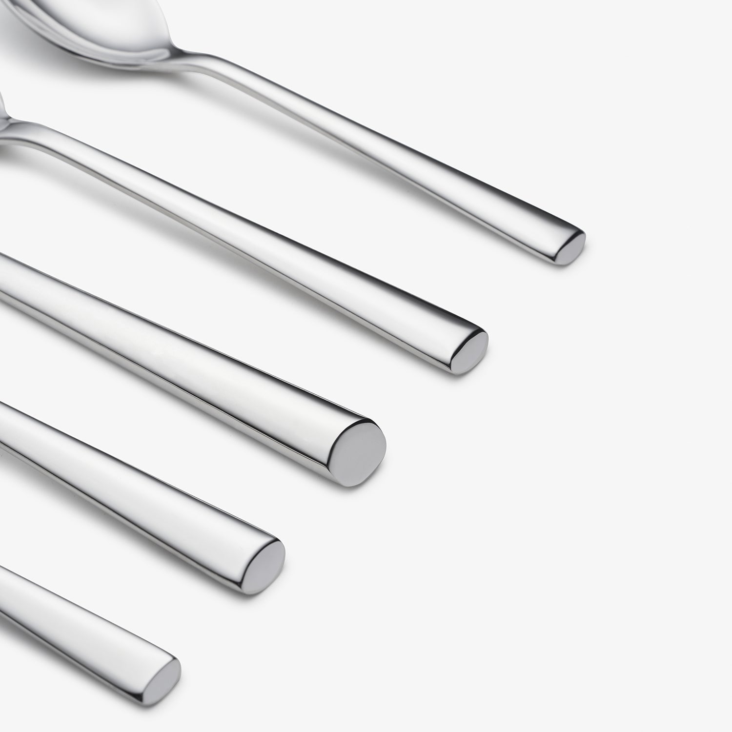 20-piece forged service for 4 with a long. flared handle and angled detail at the tip of each handle. This pattern features a polished mirror finish.