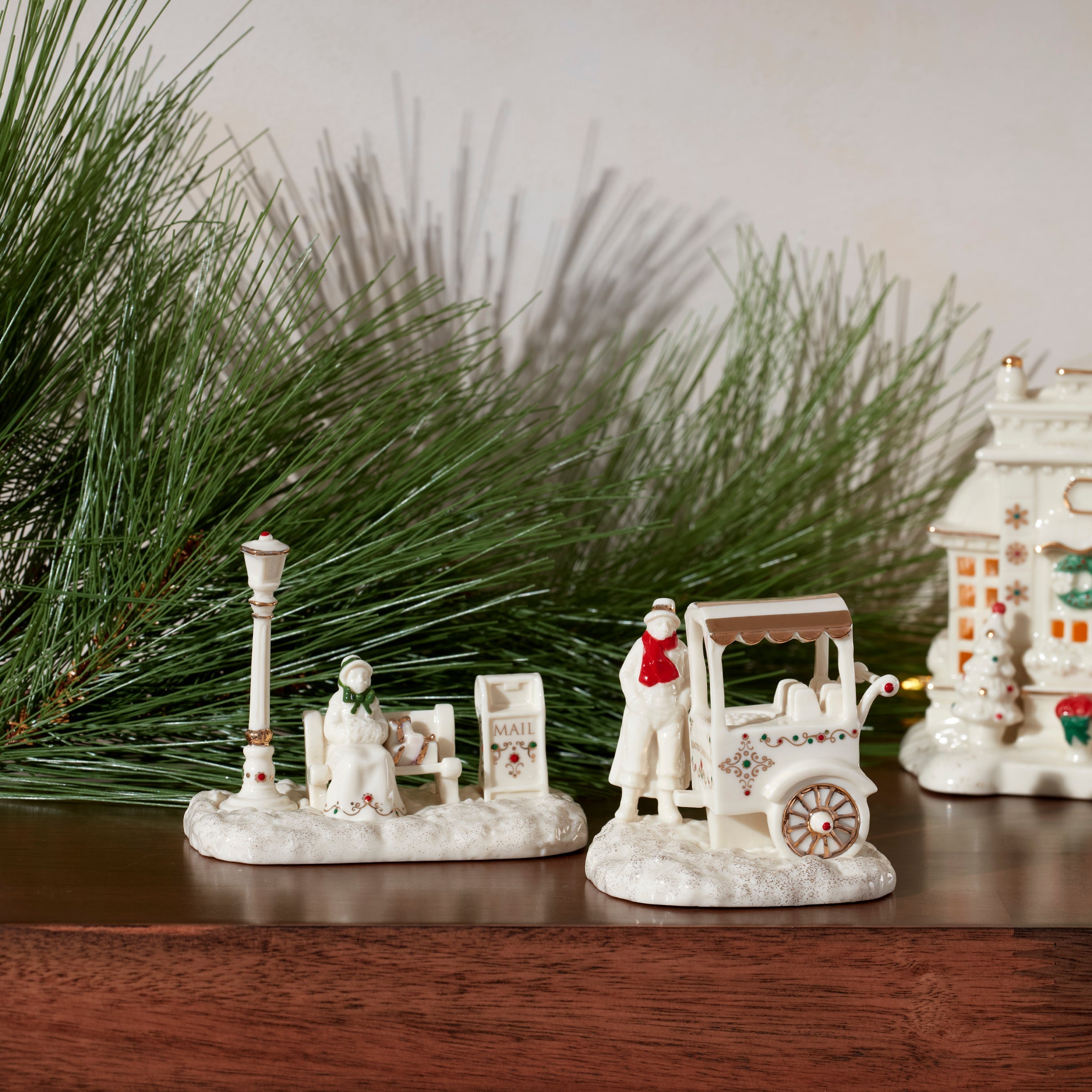 Crafted in creamy porcelain and hand-decorated with 24k gold accents. this figurine set. including a chestnut seller and a person on a park bench. brings the charm of bygone Christmases home. They’re truly charming additions to your Mistletoe Park Village Traditions collection. or any Christmas mantel display!