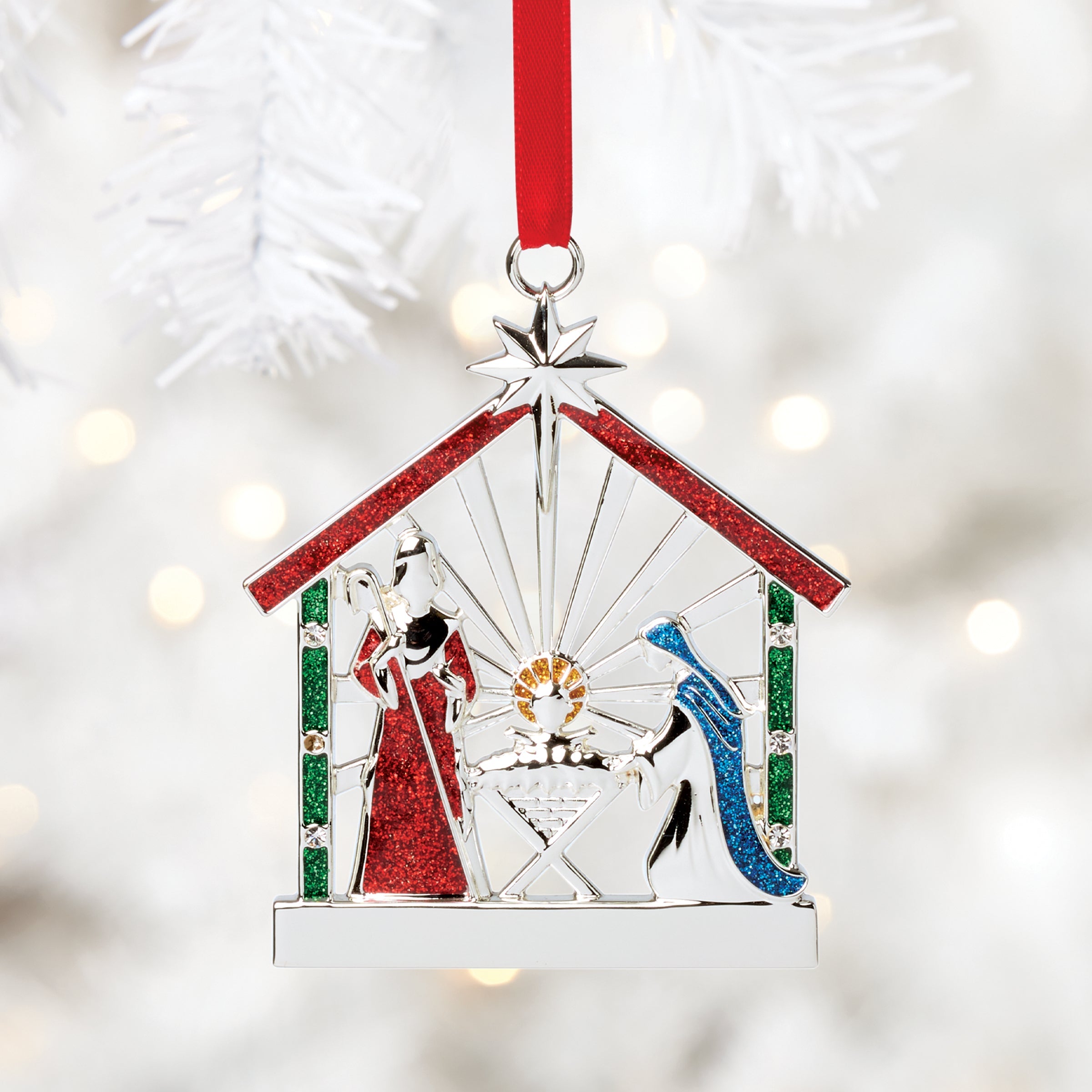 Bring the spirit of Christmas to life with this nativity scene. a stunning tribute to the season’s most cherished story. Crafted in gleaming silverplate. this ornament adds a touch of elegance and traditional charm to your tree. year after year.