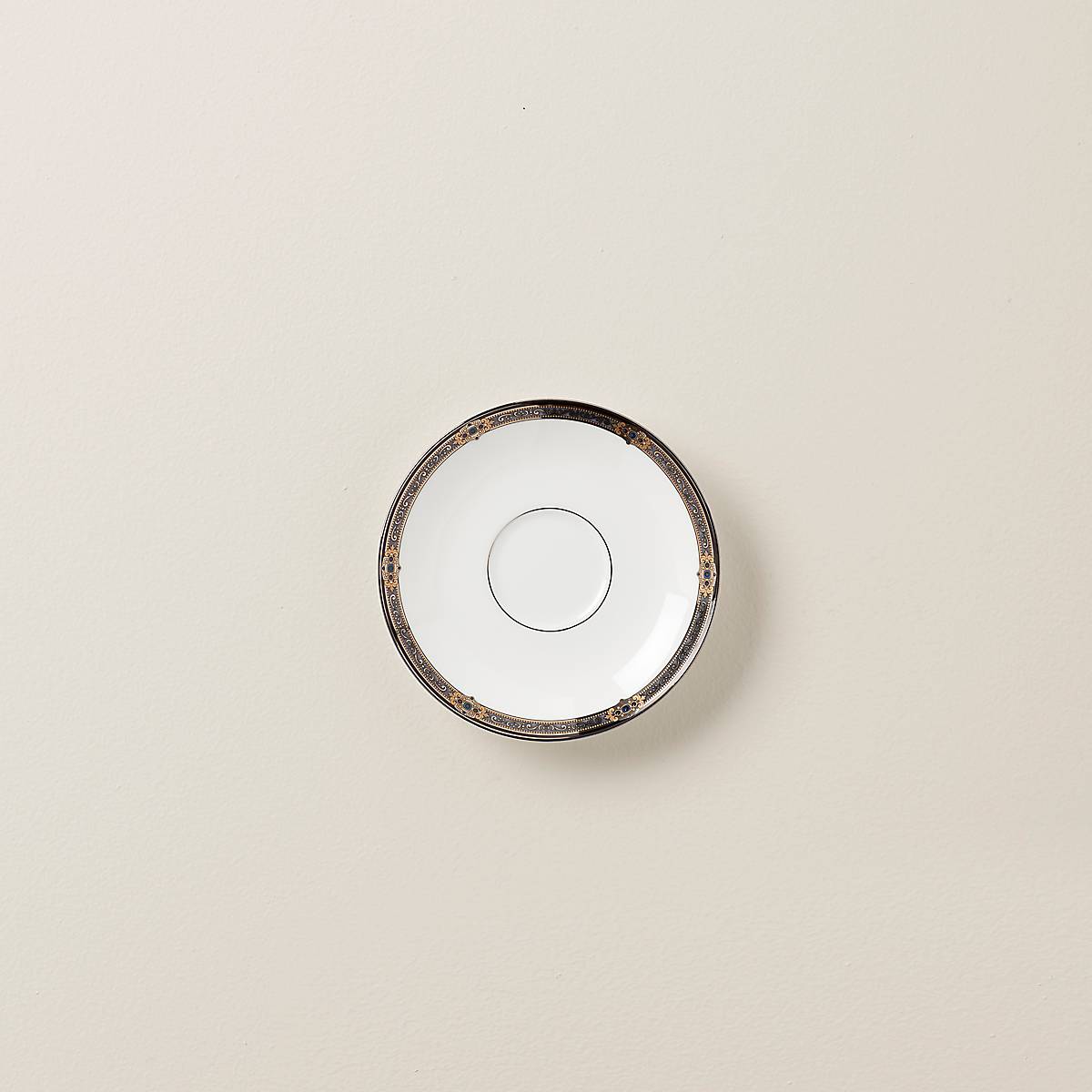 Crafted from durable white bone china. this elegant Vintage Jewel saucer plate glitters with accents of 24-karat gold and platinum along the elaborate scroll and floral pattern on its edges. while small enamel jeweling adds texture. This item is dishwasher-safe. for added convenience.